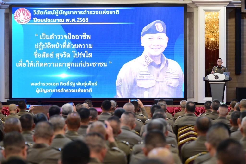 ผบ.ตร.มอบ 15 นโยบายการบริหารราชการ เน้นย้ำการเปลี่ยนแนวคิด (MINDSET) ปรับองค์กร เร่งปราบปรามอาชญากรรม เพิ่มขีดความสามารถสถานีตำรวจ ดูแลสวัสดิการตำรวจและครอบครัว สร้างความเชื่อมั่นและศรัทธาให้กับพี่น้องประชาชน เมื่อวันที่ 4 พฤศจิกายน 2567 เวลา 14.00 น. พล.ต.อ.กิตติ์รัฐ พันธุ์เพ็ชร์ ผู้บัญชาการตำรวจแห่งชาติ เป็นประธานการประชุมมอบนโยบายการบริหารราชการสำนักงานตำรวจแห่งชาติ ประจำปีงบประมาณ 2568 ณ ห้องแจ้งยอดสุข อาคารศูนย์ฝึกอบรมพัฒนาบุคลากรและสวัสดิการ สำนักงานตำรวจแห่งชาติ โดยมีรองผู้บัญชาการตำรวจแห่งชาติ , ผู้ช่วยผู้บัญชาการตำรวจแห่งชาติ , ข้าราชการตำรวจระดับ พล.ต.ต. ขึ้นไป พร้อมทั้งสมาคมแม่บ้านตำรวจ จำนวนกว่า 465 นาย เข้าร่วมประชุม ณ ห้องแจ้งยอดสุข สำนักงานตำรวจแห่งชาติ และถ่ายทอดสัญญาณผ่านสื่ออิเล็กทรอนิกส์ไปยังหน่วยงานตำรวจทั่วไปประเทศ เพื่อร่วมรับฟังวิสัยทัศน์ และนโยบายการบริหารราชการของผู้บัญชาการตำรวจคนที่ 15 ภายใต้วิสัยทัศน์ “เป็นตำรวจมืออาชีพ ปฏิบัติหน้าที่ด้วยความซื่อสัตย์ สุจริต โปร่งใส เพื่อให้เกิดความผาสุกแก่ประชาชน” โอกาสนี้ ผู้บัญชาการตำรวจแห่งชาติได้อัญเชิญพระบรมราโชวาทของพระบาทสมเด็จพระเจ้าอยู่หัว ซึ่งทรงพระกรุณาโปรดเกล้าโปรดกระหม่อมพระราชทานหนังสือชุด ธรรมนาวา “วัง” เนื่องในโอกาสพระราชพิธีมหามงคลเฉลิมพระชนมพรรษา 6 รอบ 28 กรกฎาคม 2567 ดังนี้“หลัก “ธรรม” ในพระศาสนา เป็นเรื่องสำคัญต่อมวลมนุษยชาติ และพวกเราทั้งหลายในฐานะทหาร และตำรวจ หลักปฏิบัติธรรมมะนาวาวังนี้ จะช่วยให้พวกเราได้เข้าใจในหลักธรรมคำสอนได้อย่างมีระบบระเบียบ โดยสามารถยึดถือเป็นหลักการและแนวทางในการศึกษา ฝึกปฏิบัติ ตลอดจนถึงการนำไปใช้ในการดำเนินชีวิตอนึ่งการทหาร การตำรวจ กับ หลักธรรมคำสอนในพระศาสนานั้น หากพวกเราได้ทำความเข้าใจในธรรมะและศาสนา คือคำสอนที่ว่าด้วยเรื่องของชีวิต ตามความเป็นจริง สู่การดับทุกข์อย่างลึกซึ้งแล้วนั้น จะส่งผลให้สามารถครองตนและครองคนโดยธรรมได้เป็นอย่างดีและมั่นคงต่อไป”